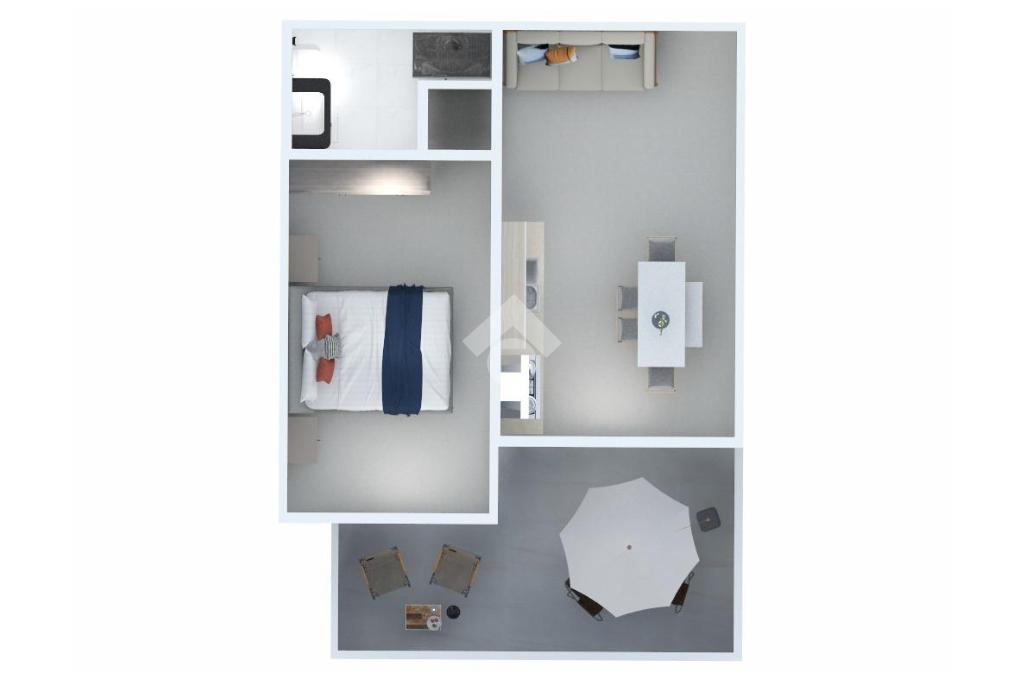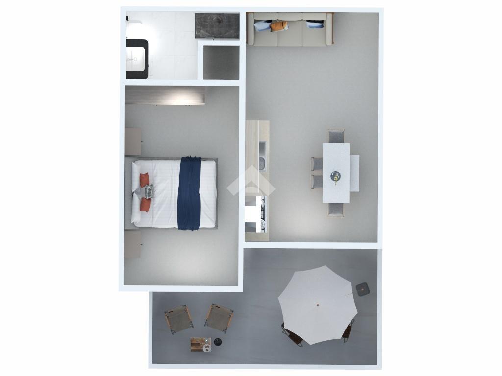 L’appartamento si trova al secondo piano ed è organizzato in modo molto funzionale: ingresso su un soggiorno luminoso che affaccia sul grande terrazzo abitabile, perfetto per vivere gli spazi esterni in tranquillità. Un disimpegno accompagna nella zona notte, composta da una camera matrimoniale e dal bagno con box doccia e finestra.