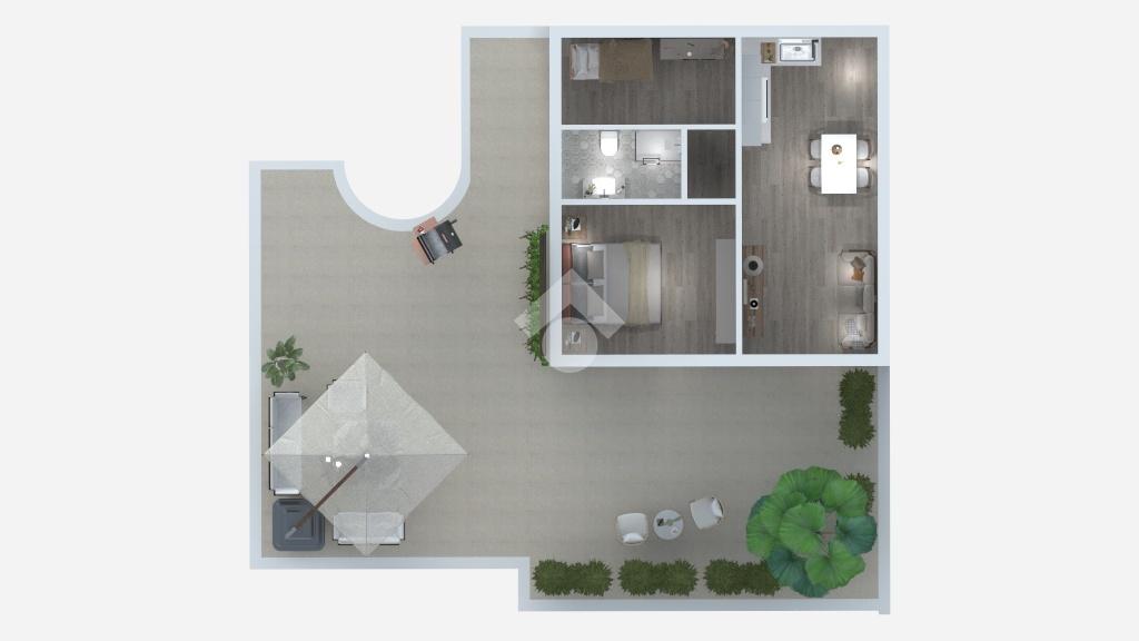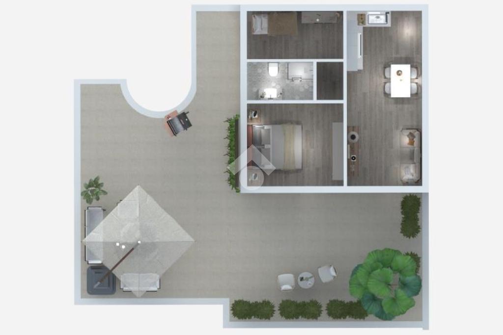 L'appartamento, dotato di doppio ingresso (indipendente e condominiale), è composto da: soggiorno con angolo cottura, camera matrimoniale, camera singola e bagno finestrato.